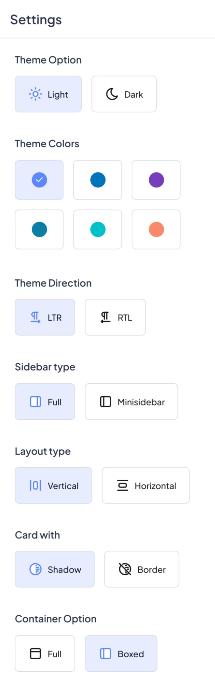 The Customizer enables you and your customers to modify the primary colors, themes, skins, layout options, and overall appearance of the template in real time.